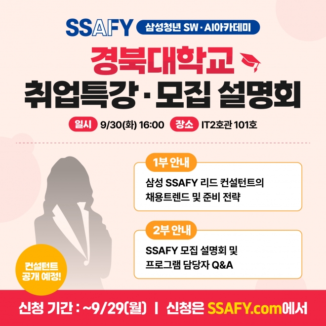제 목 | 삼성 청년SW·AI아카데미(SSAFY) 경북대학교 취업특강/모집설명회: 9.30(화) 16:00, IT2-101 | ||||