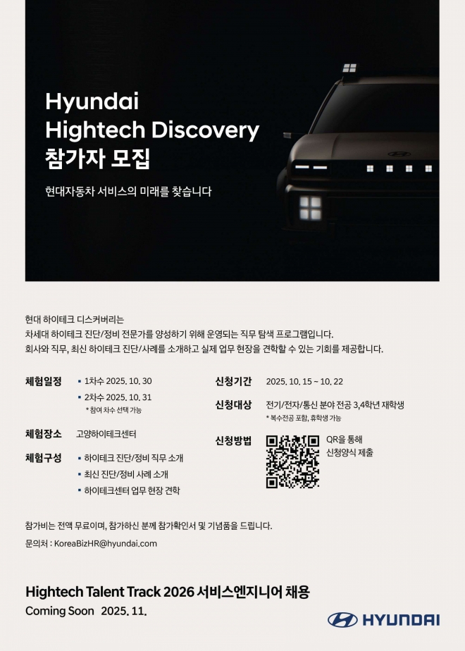 ※ 본 추천건은 현대자동차에서 운영하는 자동차 하이테크 진단/정비직무 채용과 관련하여 해당 직무소개 및 채용안내를 위한 견학 프로그램입니다. ※ 추천 희망자는 학교 추천심사를 위해서 포스터 내 QR통한 신청 후, 자유양식의 지원서를 10. 21.(화) 14:00까지 진로취업과 이메일(knujob@knu.ac.kr)로 보내주시기 바랍니다. 마감 후 내부 심사를 거쳐 추천자를 선발한 후 기업으로 명단을 송부할 예정이니, 반드시 접수 기한을 엄수하시기 바랍니다. ※ 포스터 내 QR코드를 통한 신청은, 학교추천자로 선발되지 않을 경우를 생각하여 반드시 중복 신청하시기 바랍니다. (학교추천과 개인신청 TO가 별도로 있어 기업에서 최종 선발 예정임) ※ 관련 안내사항(필수 확인 요망) - 서울역까지의 이동에 소요되는 비용은 개인부담임 - 참여대상은 전기/전자/통신/자동차관련 3~4학년 전공자(복수전공 포함, 휴학생 가능)이며, 국내 및 글로벌 자동차시장에서 서비스 엔지니어로 취업 희망자 우선 고려 - 추천서류 제출일시 : 10. 21.(화) 14:00까지 - 필수 제출서류 : 자유양식 지원서 및 자기소개서 *지원서: 이름, 학년/학기, 생년월일, 성멸, 전공(복수전공 포함), 학점(4.5기준), 연락처, 자동차관련 자격증 및 경험 반드시 포함해서 작성 *자기소개서: 자유 항목으로 작성하되 1페이지 분량(프로그램 참여 이유 및 포부 반드시 포함해서 작성) ※ 세부 전형 안내 1) 추천자 우선 심사 및 대상자 선발 : 10월 3~4주차 2) 대상자 선발 안내 : 10월 24일 3) 현대 하이테크 디스커버리 견학 : 10월 30일 또는 31일