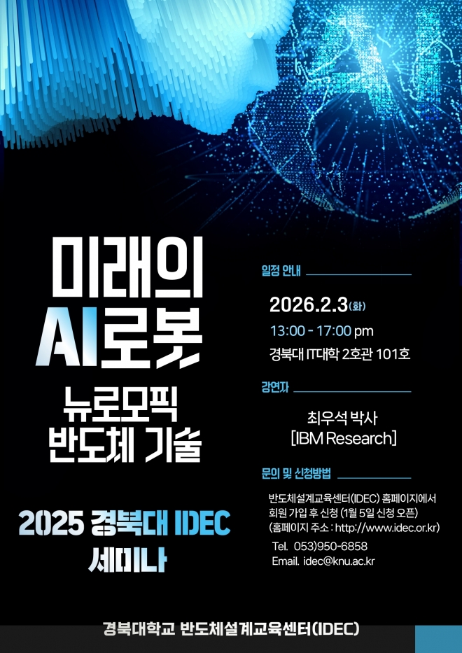 | 경북대 IDEC 지역센터는 '미래의 AI로봇 : 뉴로모픽 반도체 기술' 세미나를 준비하였습니다. 수강신청은 http://www.idec.or.kr/에서 회원 가입 후 가능합니다. 강의에 대한 자세한 내용은 아래 포스터를 참고 부탁드립니다. 많은 관심과 수강을 부탁드립니다^^ ![]() |