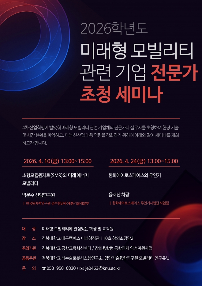 미래형 모빌리티 관련 기업 전문가 초청 세미나 개최 안내(본교 공학교육혁신센터 주관)
